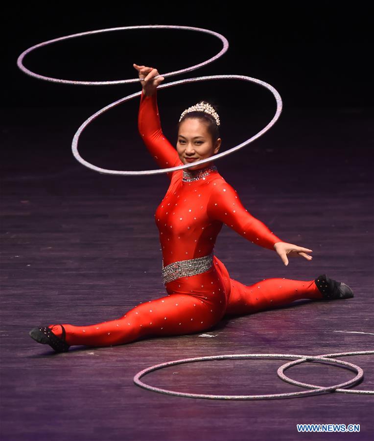 A Chinese artist performs acrobatics during a Chinese cultural and folk art show in Hawalli Governorate, Kuwait, on Sept. 23, 2019. The Chinese embassy in Kuwait and the Kuwait's National Council for Culture, Arts and Letters (NCCAL) on Monday co-organized the show to celebrate the 70th anniversary of the founding of the People's Republic of China. (Photo by Asad/Xinhua)