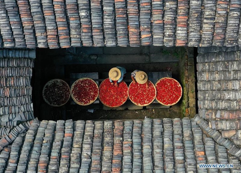 Aerial photo taken on Sept. 22, 2019 shows villagers drying chili peppers at Xiachong Village of Luoqiao Town in Changning City, central China's Hunan Province. Farmers across the country celebrate the Chinese farmers' harvest festival, which falls on the Autumn Equinox, or Sept. 23 this year. (Photo by Cao Zhengping/Xinhua)