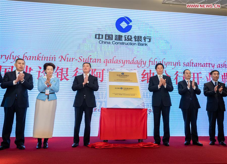 Li Zhanshu, chairman of the Standing Committee of the National People's Congress of China, and Kazakh Prime Minister Askar Mamin attend the opening ceremony of the China Construction Bank's Astana office in Kazakhstan, Sept. 23, 2019. Li paid an official goodwill visit to Kazakhstan from Sept. 21 to 25 at the invitation of Dariga Nazarbayeva, speaker of the Kazakh Parliament's Upper House, Nurlan Nigmatulin, speaker of the Kazakh Parliament's Lower House. (Xinhua/Zhai Jianlan)