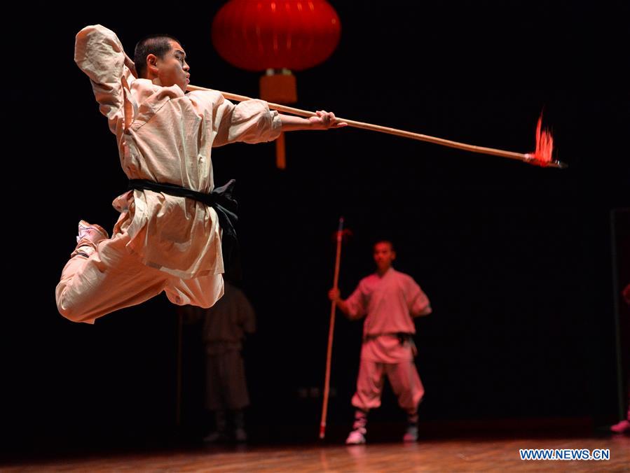 A group of Kungfu masters from central China's Henan Province perform martial arts during a reception to mark the 70th anniversary of the founding of the People's Republic of China in Bandar Seri Begawan, Brunei, Sept. 24, 2019. (Photo by Jeffrey Wong/Xinhua)