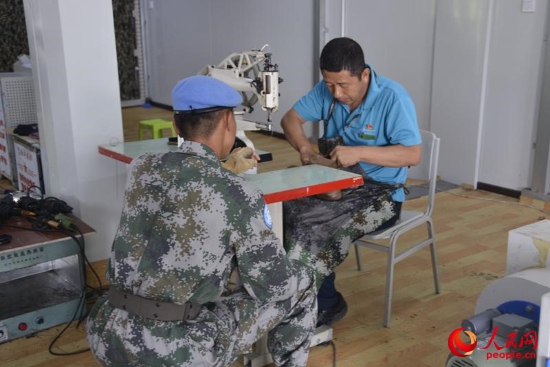 A sewer mends the military boots of a soldier. (People's Daily Online/Huang Zijuan)