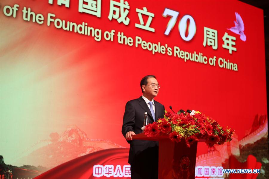 Chinese Ambassador to Turkey Deng Li speaks during a reception to celebrate the 70th anniversary of the founding of the People's Republic of China (PRC), in Ankara Sept. 26, 2019. Deng Li said on Thursday China will continue to coordinate with Turkey on international affairs and in opposing unilateralism and international bullying. (Xinhua/Zheng Siyuan)