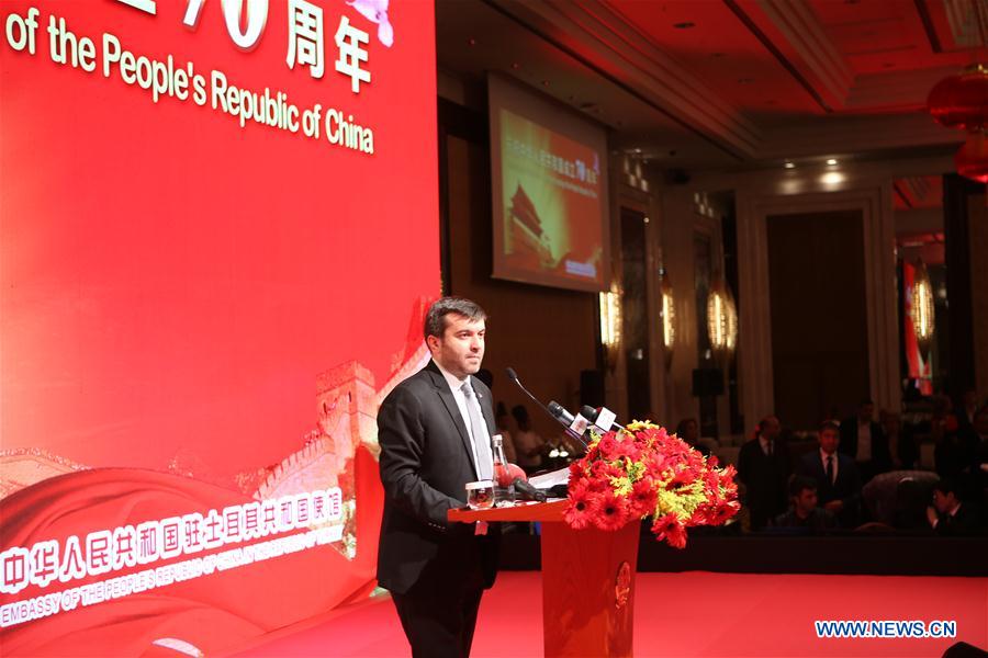 Turkish Deputy Foreign Minister Yavuz Selim Kiran speaks during a reception to celebrate the 70th anniversary of the founding of the People's Republic of China (PRC), in Ankara Sept. 26, 2019. Chinese Ambassador to Turkey Deng Li said on Thursday China will continue to coordinate with Turkey on international affairs and in opposing unilateralism and international bullying. (Xinhua/Zheng Siyuan)