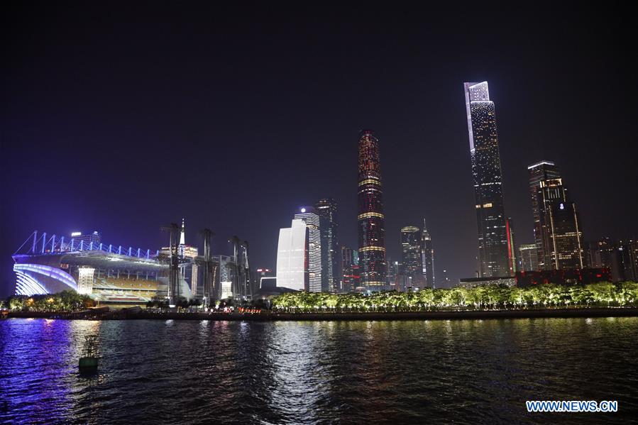 Photo taken on Sept. 28, 2019 shows a light show staged along the banks of the Pearl River to celebrate the 70th anniversary of the founding of the People's Republic of China (PRC), which falls on Oct. 1, in Guangzhou, capital of south China's Guangdong Province. (Xinhua/Huang Guobao)