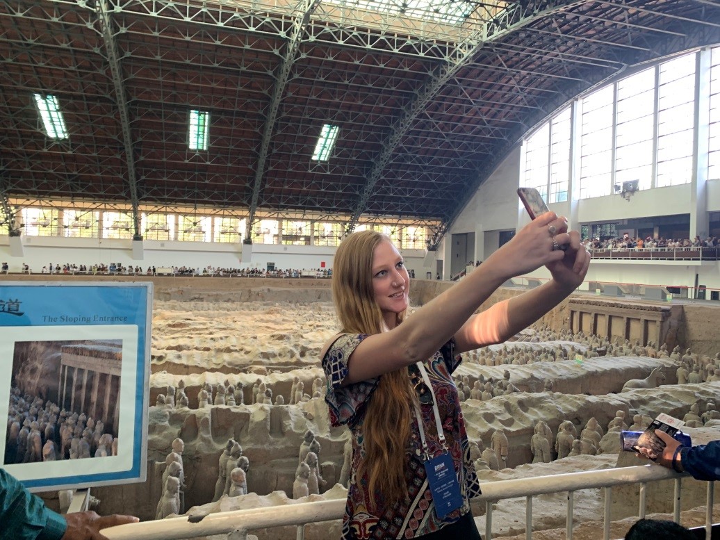Valeria Alejandra, a Chilean subeditor with El Mostrador, takes a selfie with the terracotta army. (People's Daily, Zhang Bolan)