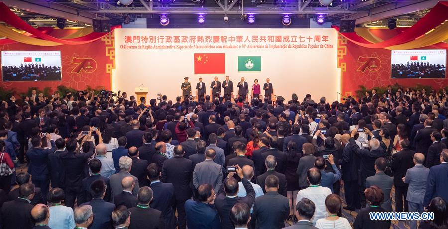 Distinguished guests propose a toast during a reception to celebrate the 70th anniversary of the founding of the People's Republic of China in south China's Macao Special Administrative Region (SAR) Sept. 29, 2019. (Xinhua)