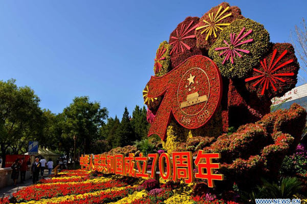 Photo taken on Sept. 23, 2019 shows a flowerbed titled "70th Anniversary of the Founding of the People's Republic of China" in Beijing, capital of China. (Xinhua/Ren Chao)