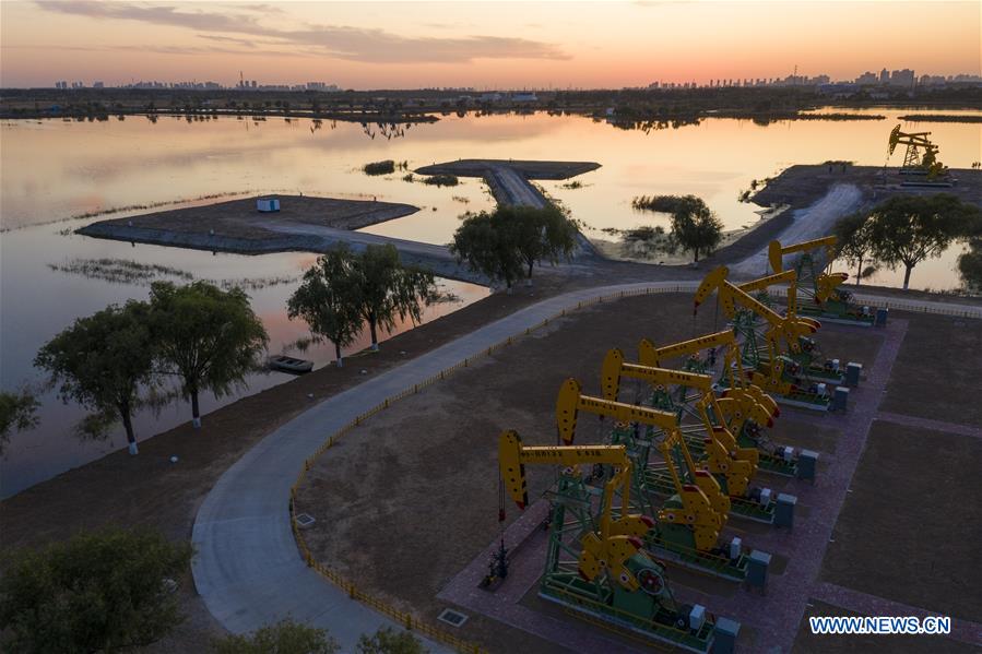 Aerial photo taken on Sept. 27, 2019 shows facilities at Daqing Oilfield in Daqing, northeast China's Heilongjiang Province. Daqing Oilfield, discovered on Sept. 26, 1959, is the largest oilfield run by PetroChina and also the country's largest oil production base. The oilfield, once accounting for over half of China's total crude output, had an annual crude production of over 50 million tonnes for 27 consecutive years and over 40 million tonnes for 12 straight years. Its annual crude oil and gas output still remains over 40 million tonnes of oil equivalent, with proven oil reserves at 6.48 billion tonnes. Its annual natural gas output has exceeded 4 billion cubic meters. (Xinhua/Xie Jianfei)