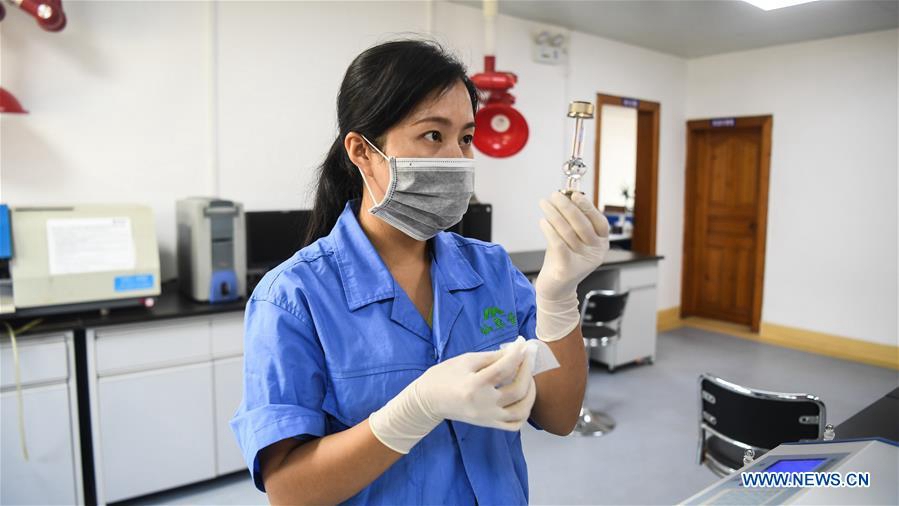 A staff member of a company conducts a testing on artemisia annua in a laboratory of Rongan County, south China's Guangxi Zhuang Autonomous Region, Sept. 29, 2019. In recent years, local companies, scientific research institutes, cooperatives and farmers in Rongan coordinate to develop artemisia annua planting industry in a bid to shake off poverty for locals. (Xinhua/Zhang Ailin)
