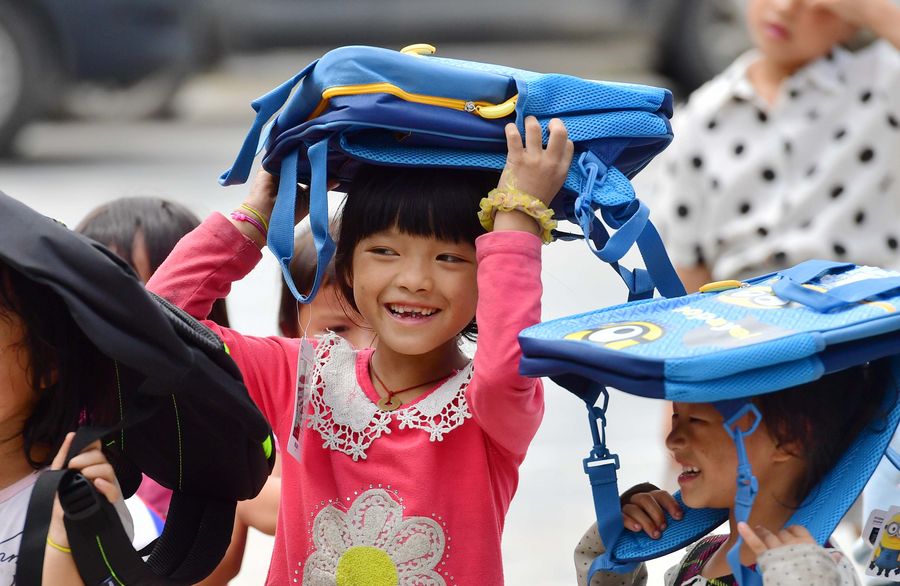 Children receive schoolbags as gifts for their summer vacation from volunteers at Wuying, a village of Miao ethnic group in southwest China, July 27, 2019. Local students' summer vacation has been enriched in recent years as more and more residents were lifted out of poverty. (Xinhua/Huang Xiaobang)