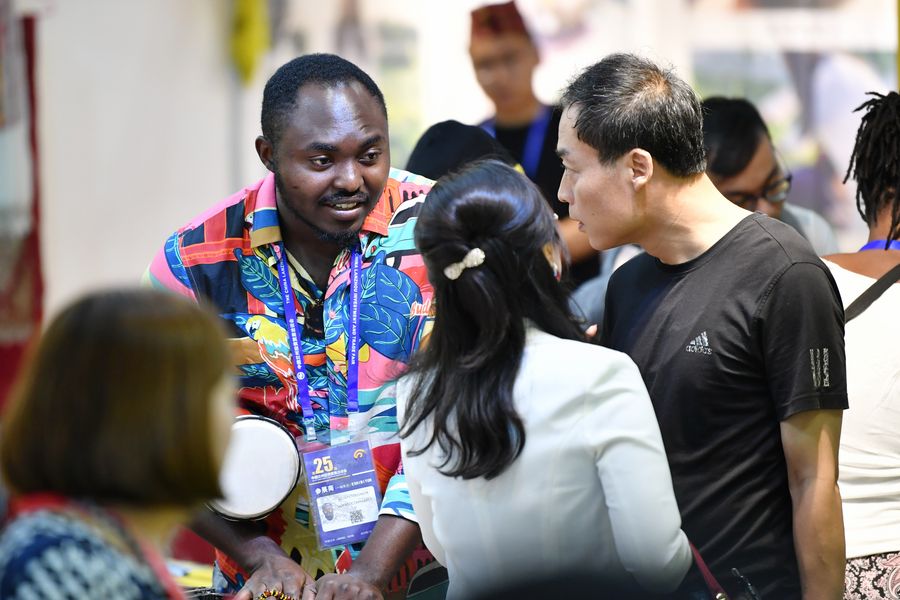 A Ghanaian exhibitor talks to guests during the Lanzhou Investment & Trade Fair in Lanzhou, capital of northwest China's Gansu Province, July 4, 2019. (Xinhua/Chen Bin)