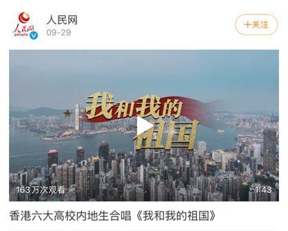 On September 29, a MV became a smash hit on the Internet. Eighteen mainland students from six Hong Kong universities starred in an MV “Me and My Motherland”, expressing their deep love for the country with melodious voice.