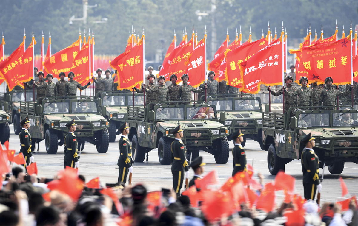 A group of soldiers holding 100 army flags representing PLA units with glorious histories rolls by for inspection during the military parade marking the 70th anniversary of the founding of the People's Republic of China in central Beijing on Tuesday. [LIU DAWEI / XINHUA]