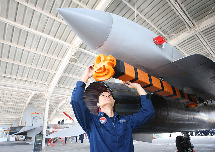Tailhook, the most ironic feature of carrier-borne fighter jet. It is designed to snare arresting wires on the carrier's deck to absorb energy and slow the aircraft while landing. [Photo by Chen Zebing/China Daily]