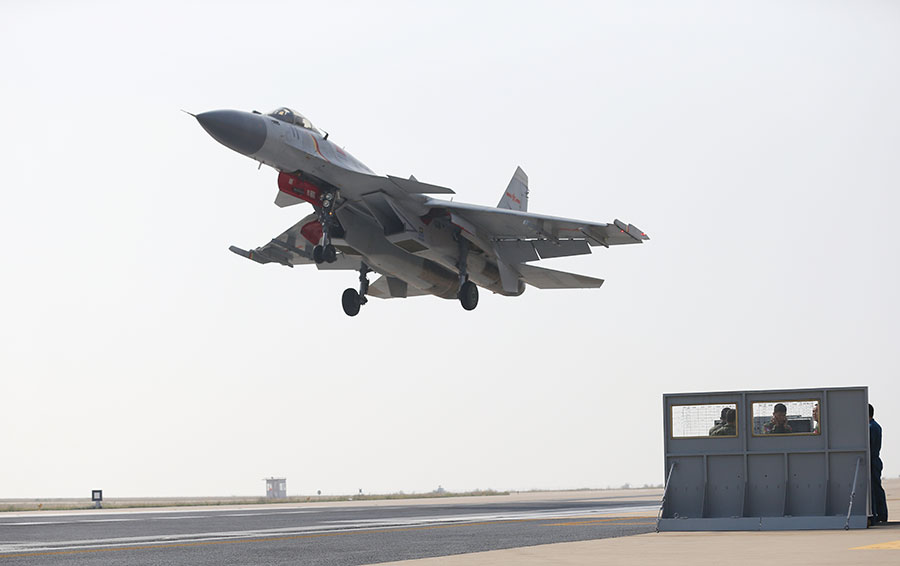 A J-15 carrier-borne fighter jet conducts a ground-based landing training last month. [Photo by Chen Zebing/China Daily]