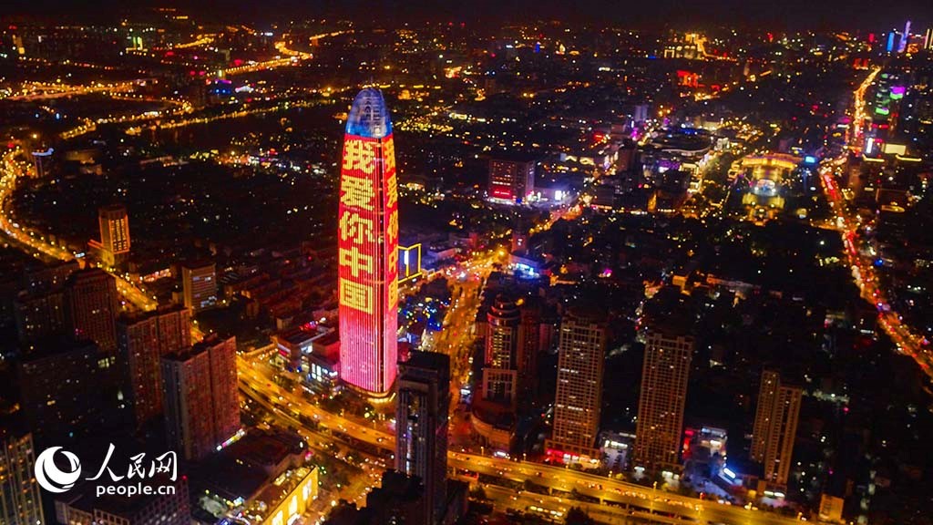 People's Daily Online designs a light show on the landmark of Jinan, Shandong province to express love to the country. (People's Daily Online/Zou Cong)