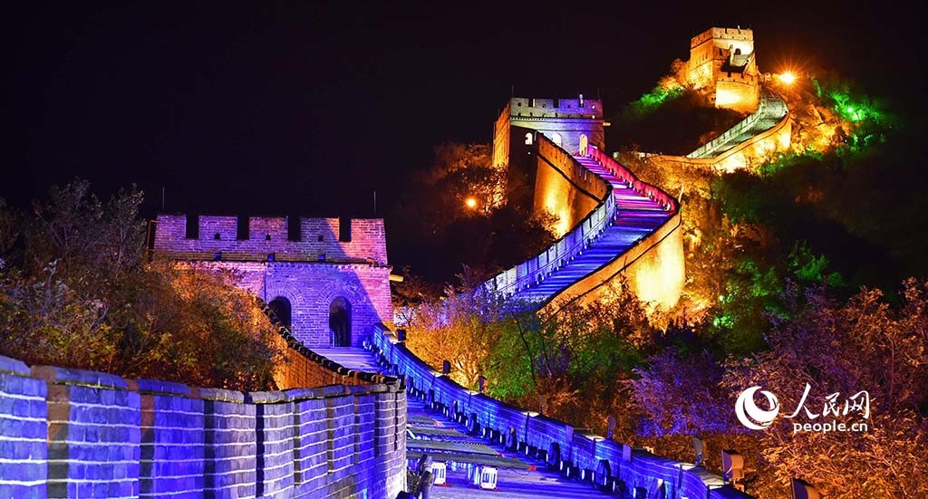 The Badaling section of the Great Wall in Beijing looks like a dragon when the lights are turned on. (People's Daily Online/Lei Sheng)