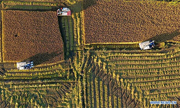 Aerial photo taken on Oct. 8, 2019 shows farmers harvesting rice with reapers in Wangtan Township of Tangshan, north China's Hebei Province. (Xinhua/Yang Shiyao)