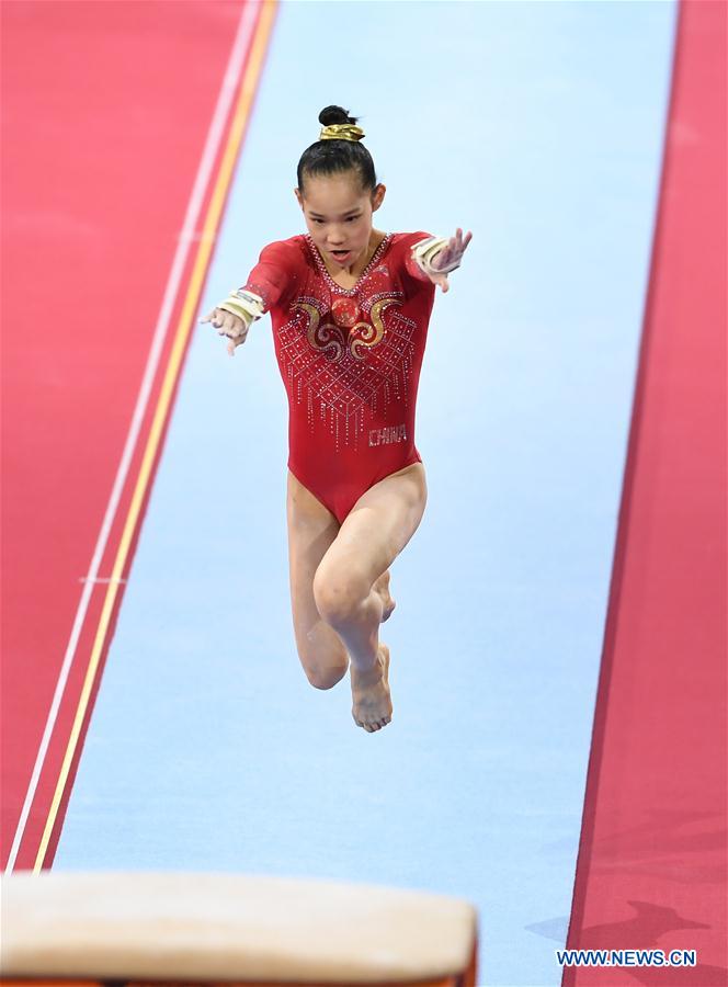 Tang Xijing of China competes on the vault during the Women's Team Final of the 2019 FIG Artistic Gymnastics World Championships in Stuttgart, Germany, Oct. 8, 2019. (Xinhua/Lu Yang)