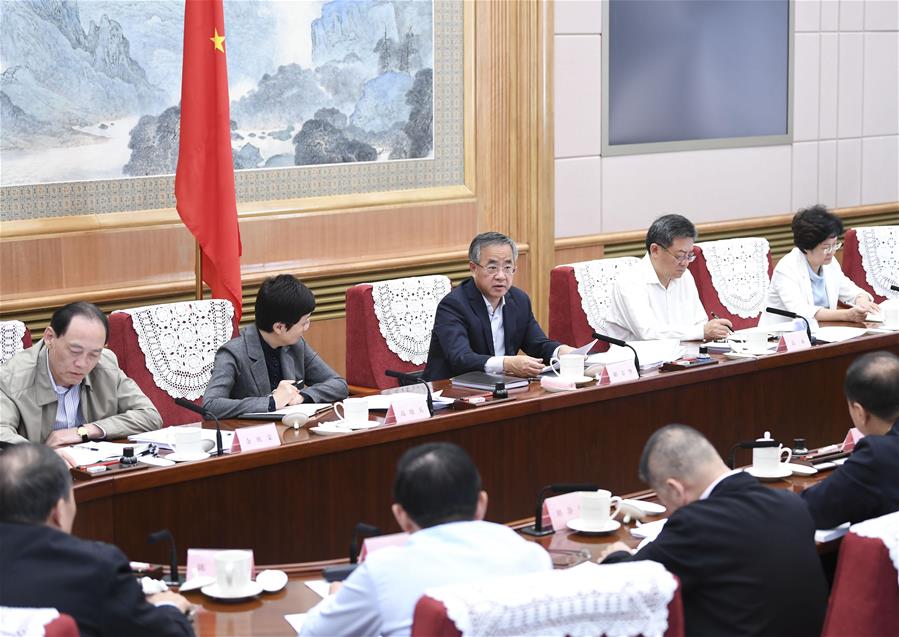Hu Chunhua, a member of the Political Bureau of the Communist Party of China Central Committee, also chief of the State Council leading group of poverty alleviation and development, presides over a plenary meeting of the leading group in Beijing, capital of China, Oct. 9, 2019. (Xinhua/Yin Bogu)