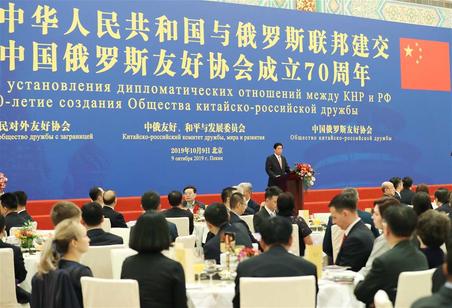 Li Zhanshu, a member of the Standing Committee of the Political Bureau of the Communist Party of China (CPC) Central Committee and chairman of the Standing Committee of the National People's Congress (NPC), speaks at a reception marking the 70th anniversary of the establishment of diplomatic relations between China and Russia and the China-Russia Friendship Association in Beijing, capital of China, Oct. 9, 2019. (Xinhua/Liu Weibing)