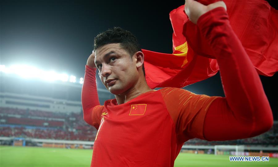 Al Kesen of China celebrates after the group A match between China and Guam at the FIFA World Cup Qatar 2022 and AFC Asian Cup China 2023 Preliminary Joint Qualification Round 2 in Guangzhou, capital of south China's Guangdong Province, Oct. 10, 2019. (Xinhua/Cao Can)