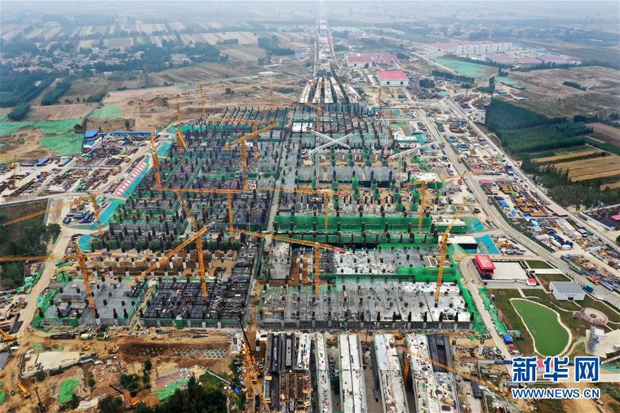 Aerial photo taken on October 10, 2019 shows the Xiongan Station of Beijing-Xiongan intercity high-speed railway under construction in Xiongan New Area, north China's Hebei Province. The major structure underground will soon be completed and workers now moves to the construction above ground. (Photo/Xinhua)