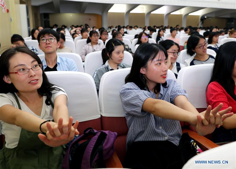 Volunteers practice cardiopulmonary resuscitation (CPR) in Shanghai, east China, Oct 11, 2019. A total of 5,720 volunteers have been recruited for the expo, said authorities responsible for the CIIE volunteer work at the Shanghai Committee of Chinese Communist Youth League. The training, which will focus on basic knowledge of the expo, business and commerce, medical assistance, garbage sorting and cultural differences, will last until late October. (Xinhua/Liu Ying)