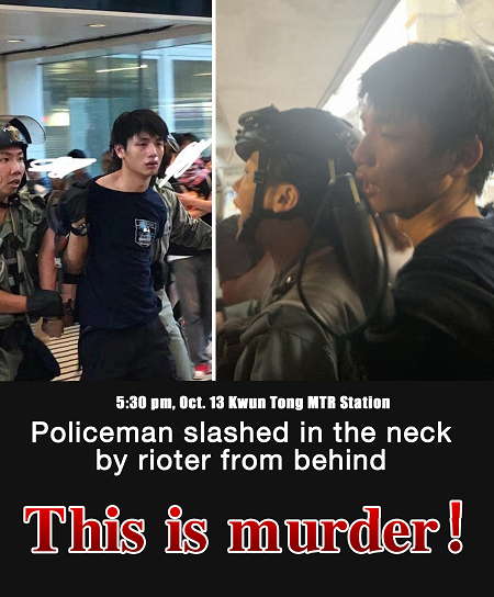 On the afternoon of Oct. 13, rioters in China’s Hong Kong Special Administrative Region (HKSAR) cut the neck of a police officer from behind when the latter was handling a case of criminal damage at the Mass Transit Railway (MTR) Kwun Tong station.