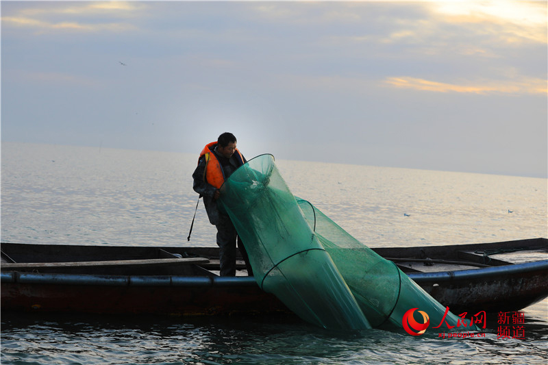 A fisherman catches pond smelts from Bosten Lake, northwest China's Xinjiang Uygur Autonomous Region, on Oct. 12, 2019. (Photo/People's Daily Online)
