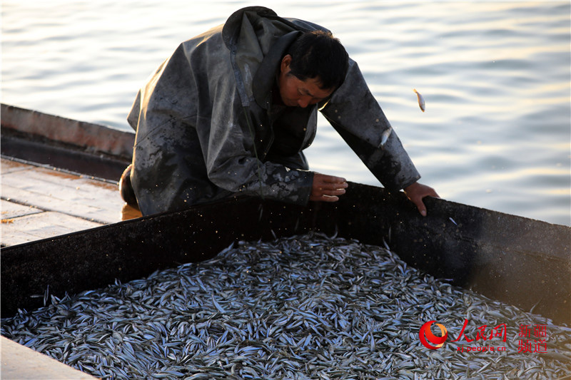 A Fisherman sorts pond smelts from the Bosten Lake, northwest China's Xinjiang Uygur Autonomous Region, on Oct. 12, 2019. (Photo/People's Daily Online)