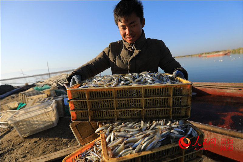 A fisherman carries pond smelts at a fishing pier of Bosten Lake, northwest China's Xinjiang Uygur Autonomous Region, on Oct. 12, 2019. (Photo/People's Daily Online)