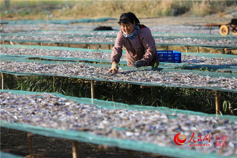 A women sun-dries pond smelts at a fishing pier of Bosten Lake, northwest China's Xinjiang Uygur Autonomous Region. (Photo/People's Daily Online)