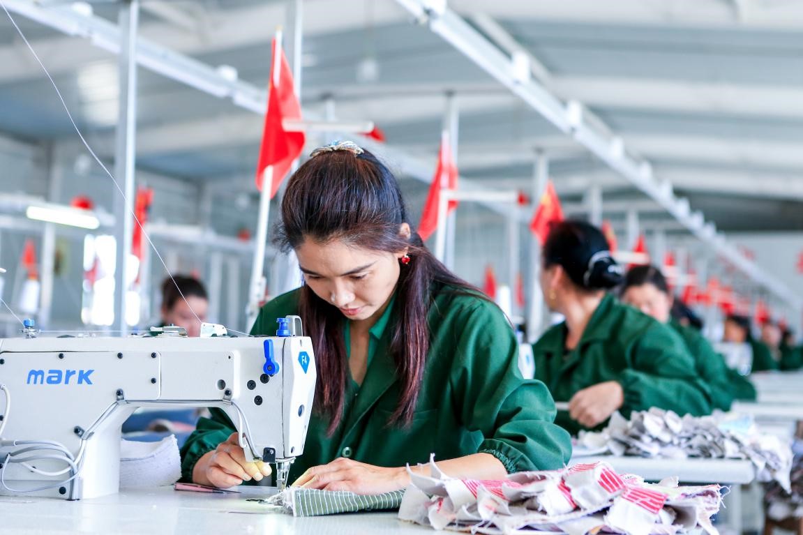 Photo taken on May 10, 2019 shows women work at a village-run garment factory in Toibouledy village, Toibouledy township, Shaya county of Asku Prefecture. (Photo by Yu Liudong)
