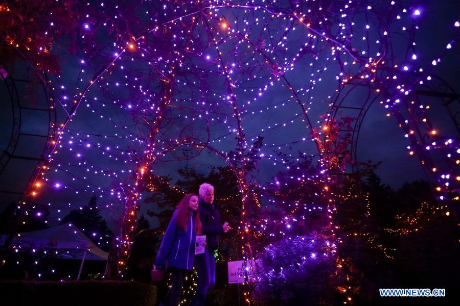 People enjoy the lighting displays while attending the Halloween themed "Glow in the Garden" event at VanDusen Garden in Vancouver, Canada, Oct. 16, 2019. (Photo by Liang Sen/Xinhua)