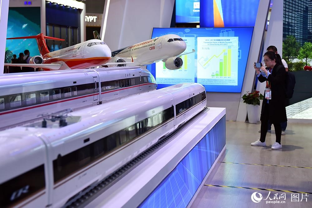 Models of Chinese high-speed trains and passenger airplanes C919 are exhibited at the first CIIE. (Photo/Weng Qiyu, People’s Daily Online)