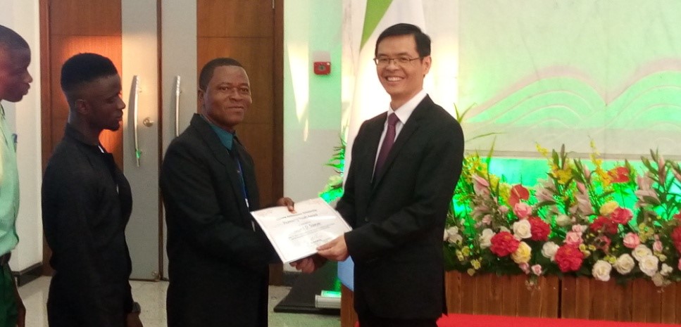 The Chinese ambassador to Sierra Leone, Hu Zhangliang, presents awards and scholarships to students (Thursday 17th October 2019)