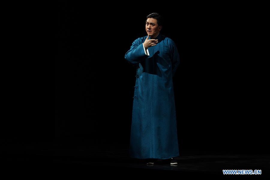 A performer acts in a modern Peking opera show depicting the story of Peking opera master Mei Lanfang in Nanjing, capital of east China's Jiangsu Province, Oct. 22, 2019. (Xinhua/Ji Chunpeng)