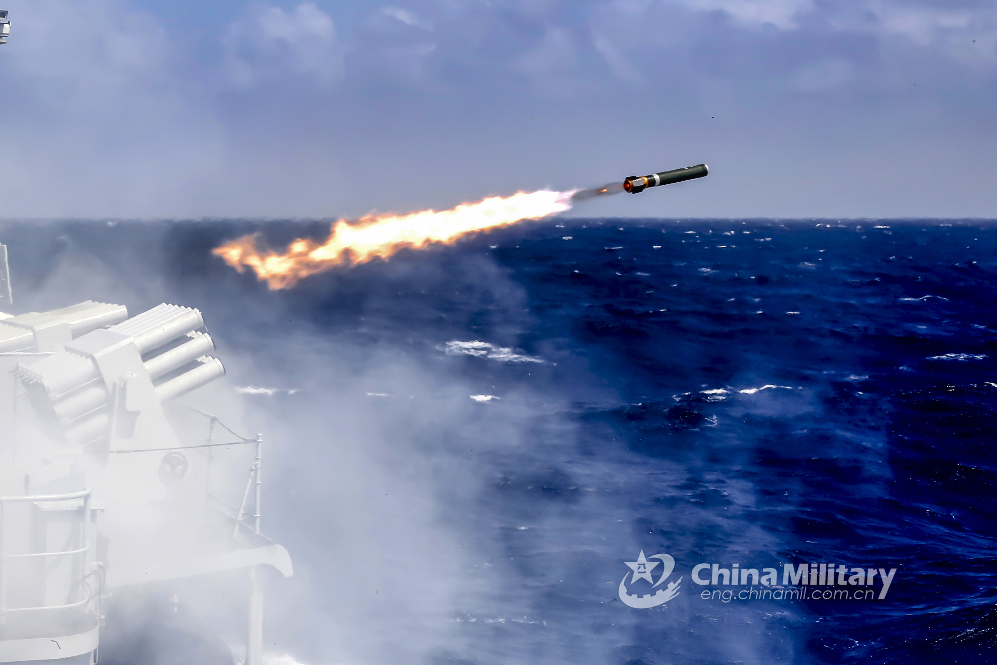 The guided-missile destroyer Hohhot (Hull 161) attached to a destroyer flotilla with the navy under the PLA Southern Theater Command discharges chaff-jamming to defend the attack of anti-ship missiles during a maritime real combat training exercise in mid-October, 2019. (eng.chinamil.com.cn/Photo by Xu Guang,Li Wei and Wu Kangci)