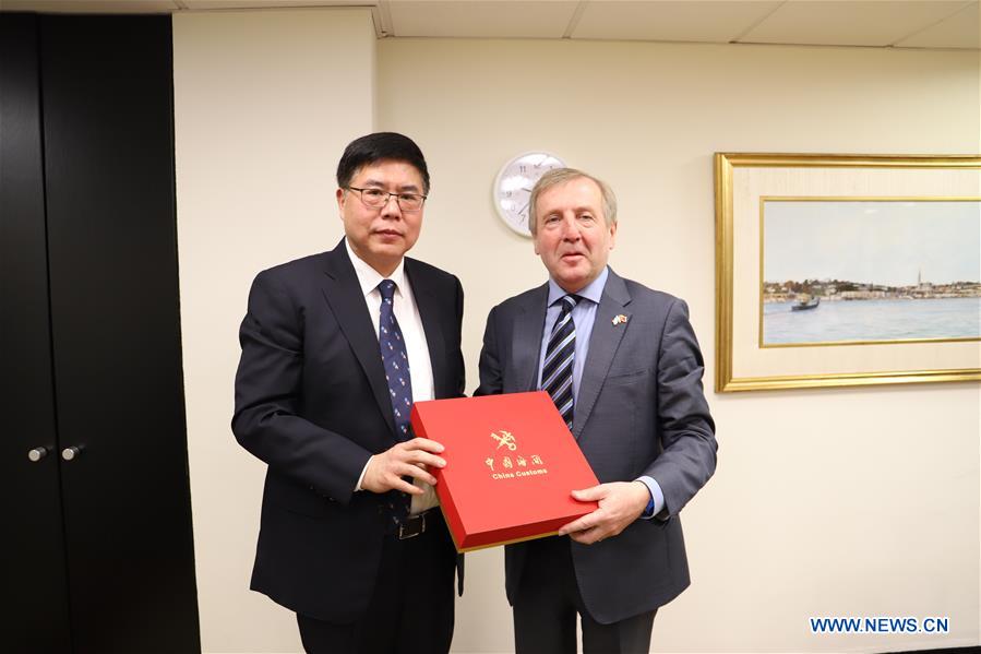 Zou Zhiwu (L), deputy head of the General Administration of Customs of China (GAC), and Michael Creed, Irish Minister for Agriculture, Food and the Marine, pose for a photo after a meeting in Dublin, Ireland, on Oct. 30, 2019. China and Ireland on Wednesday aimed to keep the strong growing momentum of trade between the two countries. (Xinhua)
