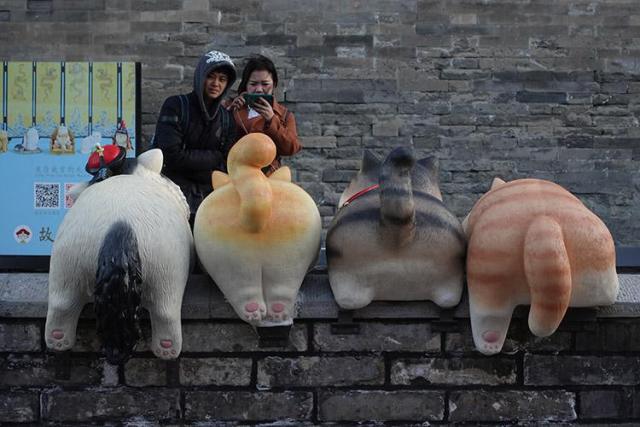 Giant statues of cats, dressed as imperial guards of the Ming and Qing Dynasties, sit near the gate of divine prowess at Beijing’s Palace Museum. Large groups of visitors take pictures with these adorable “royal cats” on Oct. 28, 2019. (The Beijing News/Li Kaixiang)