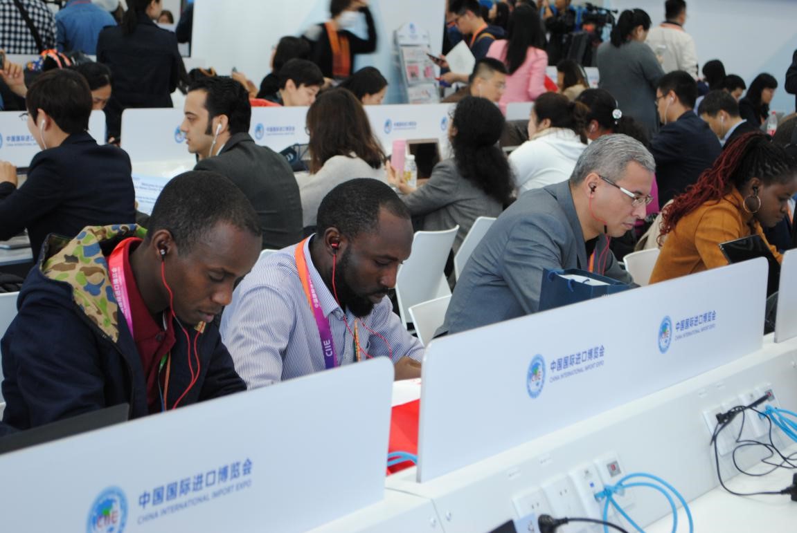 Foreign reporters work at the media center of the second CIIE. (Photo by Mo Zongcong/People’s Daily)