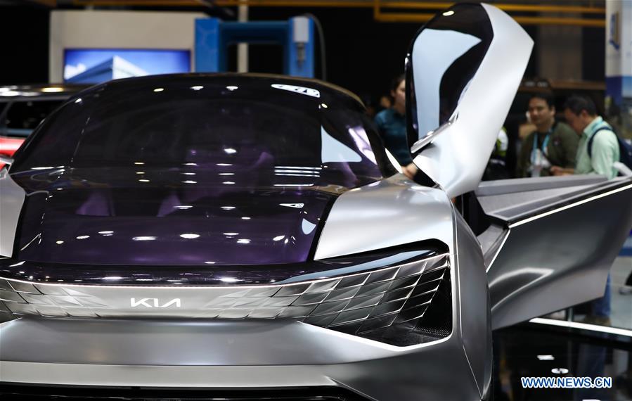 People look at a concept car of Kia Motors at the Automobile exhibition area during the second China International Import Expo (CIIE) in Shanghai, east China, Nov. 6, 2019. The National Exhibition and Convention Center in Shanghai greeted a large number of visitors on the second day of the CIIE. (Xinhua/Ding Ting)