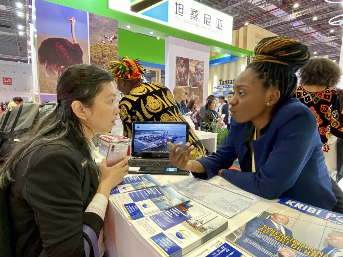 A staff member at the Cameroon Pavilion discusses business with a Chinese buyer at the second CIIE. (People’s Daily/Wang Xiaobo)