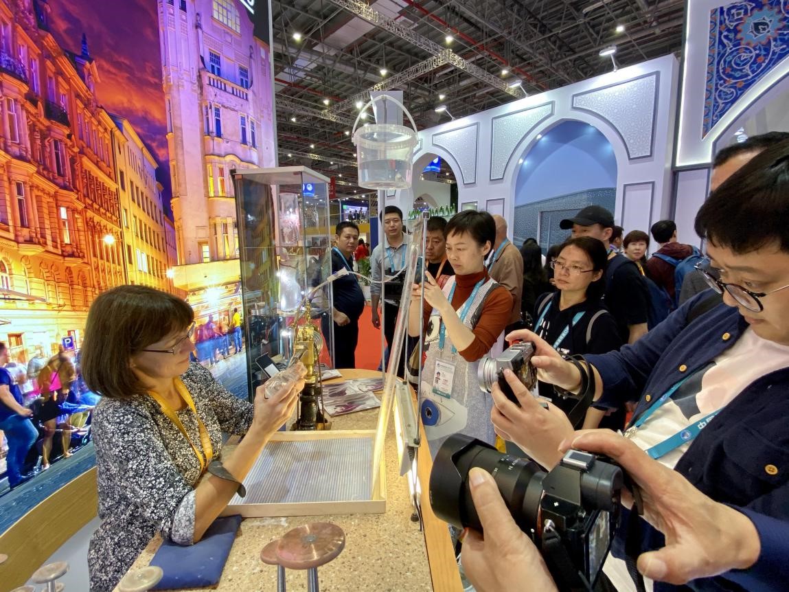A woman at the Czech Republic Pavilion of the second CIIE shows a crystal carving to visitors. (People’s Daily/Wang Xiaobo)