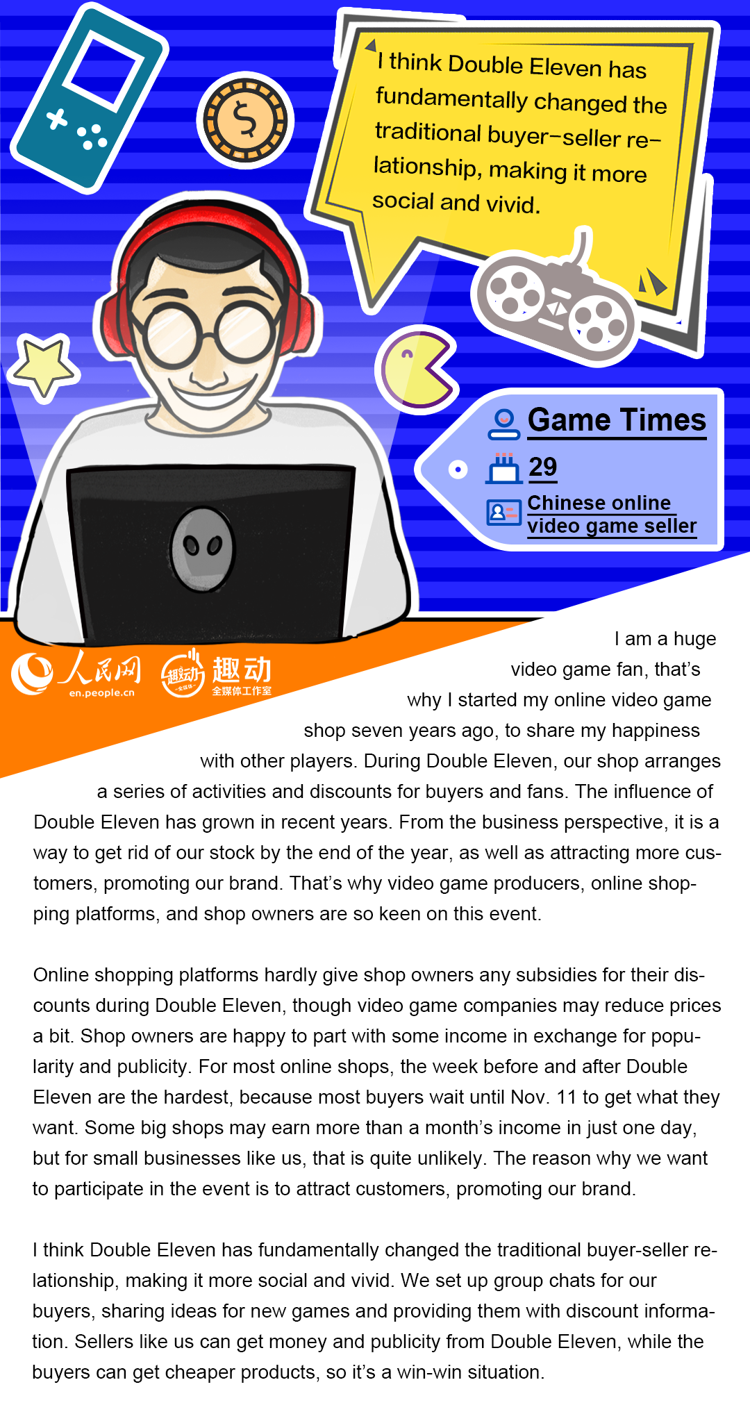 I am a huge video game fan, that’s why I started my online video game shop seven years ago, to share my happiness with other players. During Double Eleven, our shop arranges a series of activities and discounts for buyers and fans. The influence of Double Eleven has grown in recent years. From the business perspective, it is a way to get rid of our stock by the end of the year, as well as attracting more customers, promoting our brand. That’s why video game producers, online shopping platforms, and shop owners are so keen on this event.