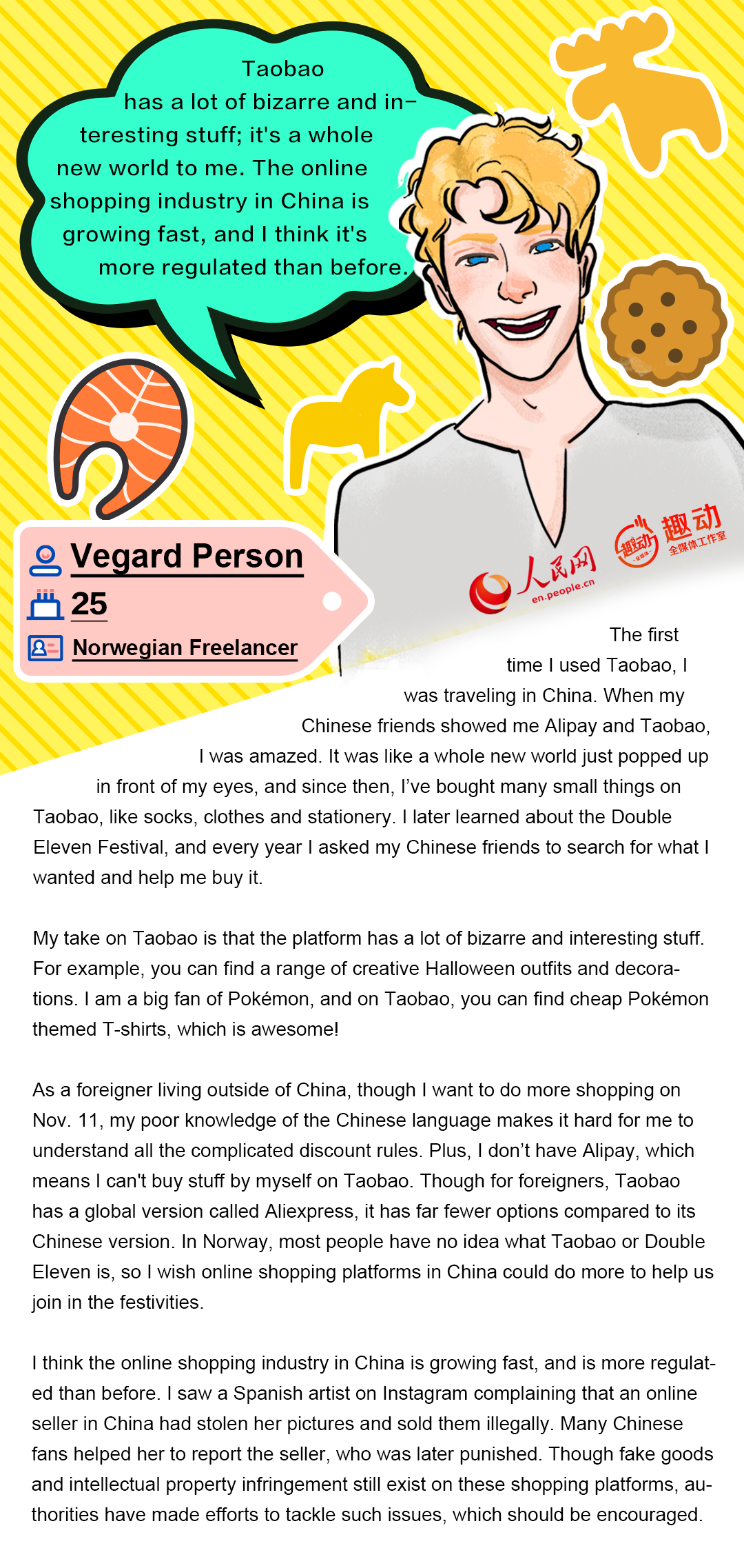 As a foreigner living outside of China, though I want to do more shopping on Nov. 11, my poor knowledge of the Chinese language makes it hard for me to understand all the complicated discount rules. Plus, I don’t have Alipay, which means I can't buy stuff by myself on Taobao. Though for foreigners, Taobao has a global version called Aliexpress, it has far fewer options compared to its Chinese version. In Norway, most people have no idea what Taobao or Double Eleven is, so I wish online shopping platforms in China could do more to help us join in the festivities.