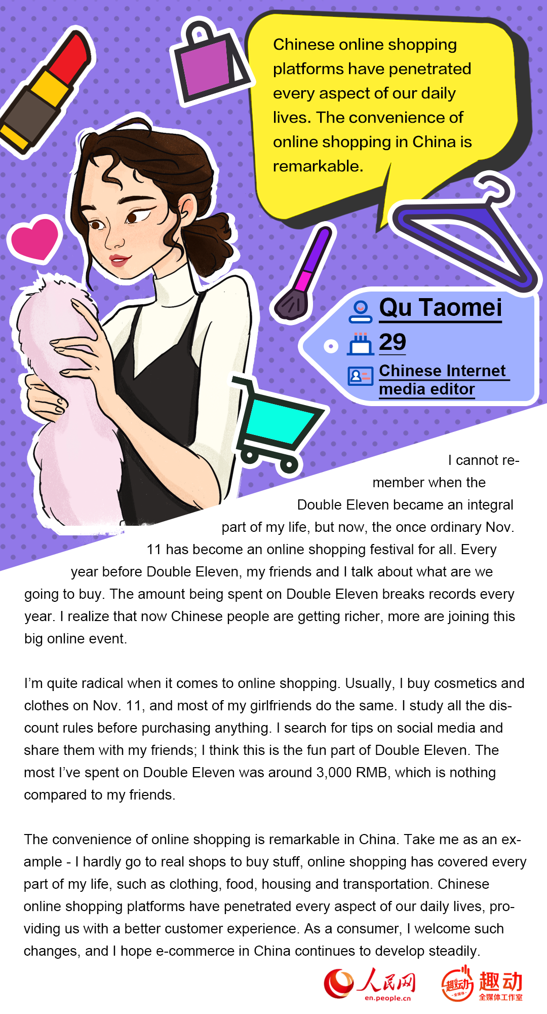 I cannot remember when the Double Eleven became an integral part of my life, but now, the once ordinary Nov. 11 has become an online shopping festival for all. Every year before Double Eleven, my friends and I talk about what are we going to buy. The amount being spent on Double Eleven breaks records every year. I realize that now Chinese people are getting richer, more are joining this big online event.