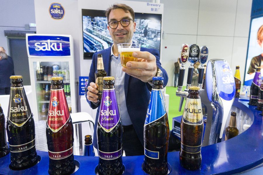A staff member shows a cup of beer from Estonia at Food and Agricultural Products exhibition area during the second China International Import Expo in Shanghai, east China, Nov. 7, 2019. (Xinhua/Cai Yang)