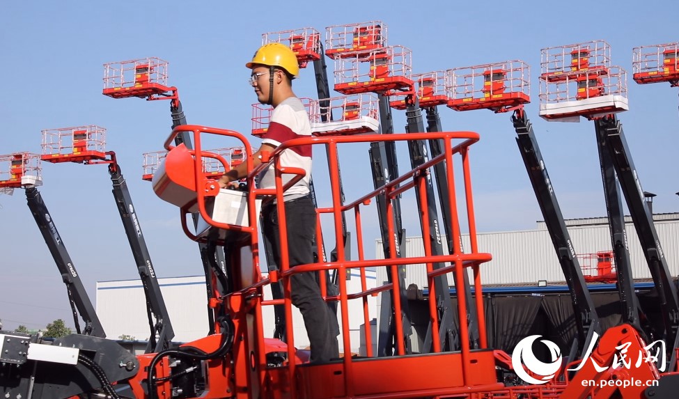 A worker tests an aerial work platform at Sinoboom. (Photo: Yuan Meng/People's Daily Online)